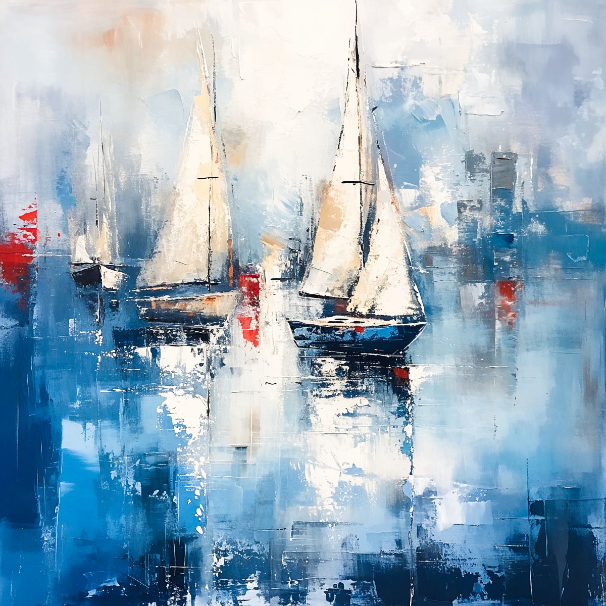 This artwork features abstract sailboats gracefully gliding across a calm sea, executed with expressive brushstrokes. The boats appear mid-journey, their sails full of silent wind, suggesting peaceful motion and timelessness.